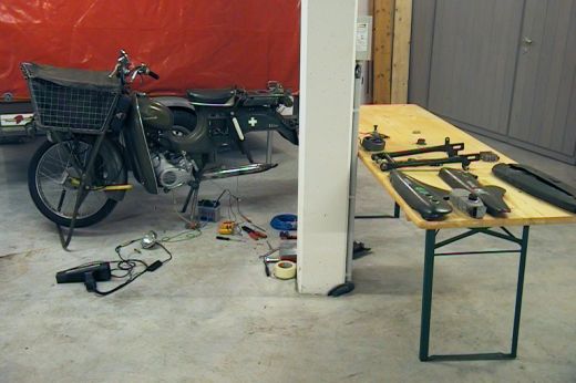 Apfelsinenkisten in der Werkstatt herum. Die Ersatzteilversorgung scheint