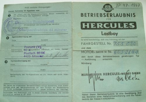 "Moped Hercules Lastboy von der Deutschen Bundespost mit Papiere.