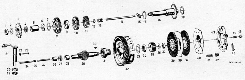 Das schmale Rad (k) ist auf der Hauptwelle fest und dient dem Tachoantrieb, da sich die Hauptwelle immer proportional zur Fahrgeschwindigkeit dreht. Am rechten Ende ragt die Ziehkeilwelle aus der Hauptwelle heraus. Die Zahnräder der Nebenwelle (o) sind mit ihr fest verbunden. Sie dreht sich immer proportional zur Kurbelwellendrehzahl.